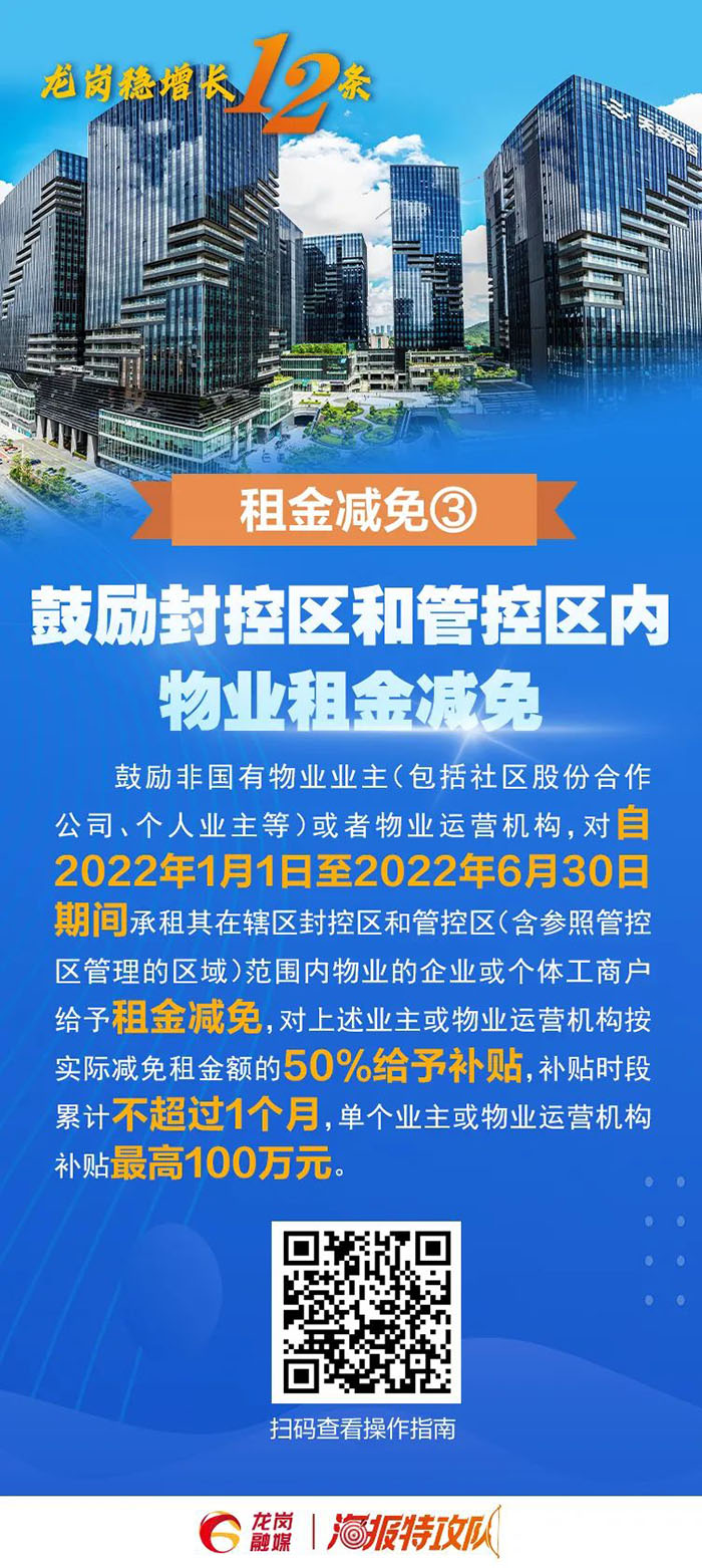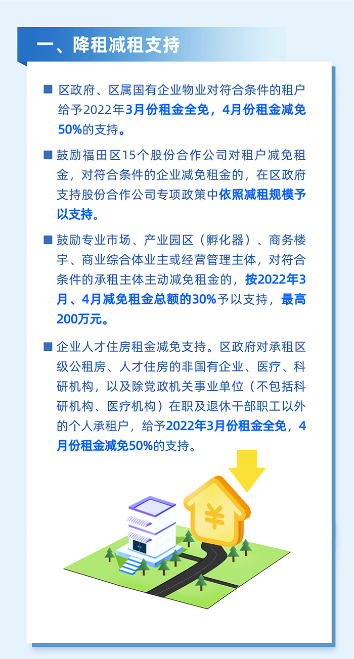 4.鼓勵(lì)寫(xiě)字樓、商場(chǎng)、商業(yè)綜合體、專(zhuān)業(yè)園區(qū)等各類(lèi)業(yè)主與租戶(hù)共克時(shí)艱,協(xié)商免租、減租、緩租。對(duì)南山區(qū)商業(yè)綜合體、購(gòu)物中心、大型綜合性商業(yè)零售企業(yè)的經(jīng)營(yíng)管理主體符合條件的承租企業(yè)減免租金天數(shù)在半個(gè)月(含)以上的,按照2022年2月1日至3月31日期間減免租金總額的30%給予經(jīng)營(yíng)管理主體最高200萬(wàn)元的資金支持。(責(zé)任單位:區(qū)工業(yè)和信息化局)