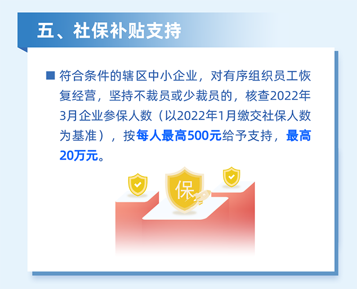 5.對(duì)南山區(qū)企業(yè)在深圳居住的員工,居住地自2022年2月1日至3月31日期間,因疫情防控被劃定為封控區(qū)、管控區(qū)(含參照管控區(qū)管理區(qū))而影響正常工作的,根據(jù)企業(yè)實(shí)際受影響的員工人數(shù)給予企業(yè)一次性社保補(bǔ)貼。按企業(yè)為受影響員工上月實(shí)際繳納社會(huì)保險(xiǎn)費(fèi)的30%且每人不超過(guò)600元,給予每家企業(yè)最高不超過(guò)10萬(wàn)元的社保補(bǔ)貼。(責(zé)任單位:區(qū)人力資源局)
