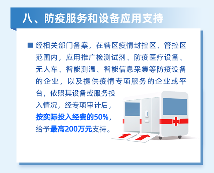 減輕企業(yè)防疫負(fù)擔(dān)。對(duì)為員工采購(gòu)口罩、測(cè)溫槍、消毒劑、核酸檢測(cè)產(chǎn)品等防疫用品,以及應(yīng)用檢測(cè)試劑、防疫醫(yī)療設(shè)備、智能測(cè)溫、數(shù)字化信息采集、無(wú)人車(chē)等數(shù)字防疫設(shè)備的區(qū)四類(lèi)百?gòu)?qiáng)企業(yè),按2022年3月實(shí)際繳納失業(yè)保險(xiǎn)人數(shù)給予100元/人的補(bǔ)貼,單家企業(yè)最高20萬(wàn)元。(牽頭單位:區(qū)工業(yè)和信息化局、科技創(chuàng)新局)