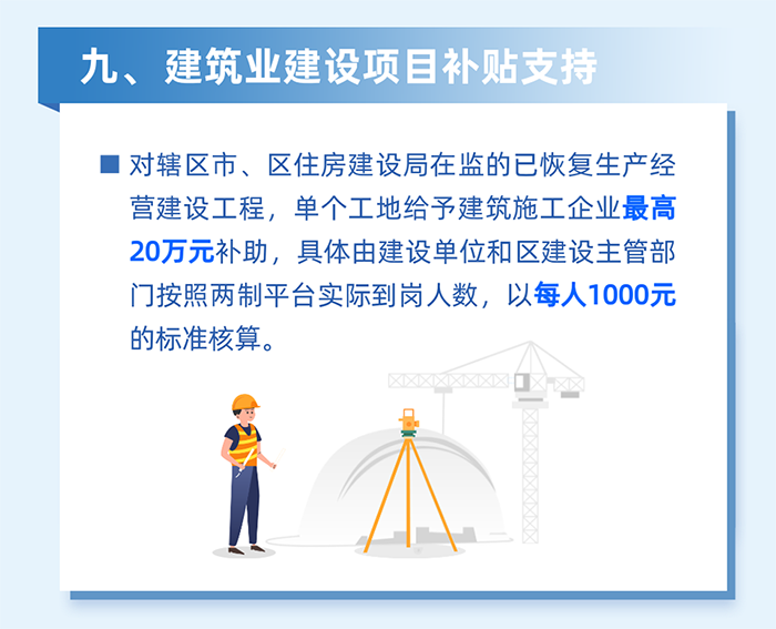 發(fā)放在建項(xiàng)目臨時(shí)停工補(bǔ)貼。對(duì)轄區(qū)范圍內(nèi)區(qū)住建、區(qū)水務(wù)、區(qū)城管、區(qū)交通以及街道在監(jiān)的已開(kāi)工建設(shè)工程,在政府依法采取停工等緊急措施期間,按市區(qū)政府部門(mén)停工通知前一天錄入“兩制”平臺(tái)的勞務(wù)工人數(shù)給予900元/人的補(bǔ)貼給企業(yè),相關(guān)補(bǔ)貼由企業(yè)通過(guò)“兩制”平臺(tái)發(fā)放至勞務(wù)工人賬戶(hù)。(牽頭單位:區(qū)住房和建設(shè)局)