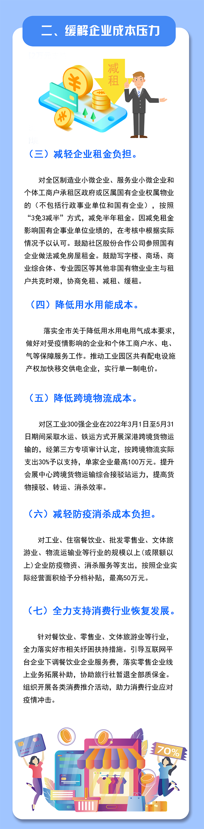 助力重點(diǎn)行業(yè)應(yīng)對(duì)疫情沖擊。對(duì)主動(dòng)配合疫情防控并在條件具備時(shí)開(kāi)展經(jīng)營(yíng)的限額以上住宿(隔離酒店除外)、餐飲、汽車(chē)銷(xiāo)售企業(yè),以及納統(tǒng)景區(qū)、旅行社、電影院、體育、演藝娛樂(lè)場(chǎng)所,給予2022年3月1日至5月31日期間實(shí)際支付租金總額20%的補(bǔ)貼,最高20萬(wàn)元(承租創(chuàng)新型產(chǎn)業(yè)用房、已享受第一條免租減租政策的除外)。(牽頭單位:區(qū)工業(yè)和信息化局、文化廣電旅游體育局)
